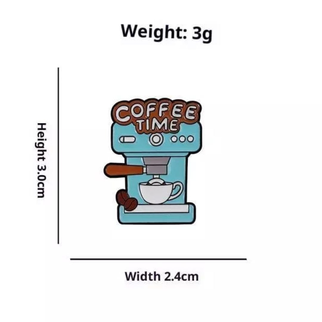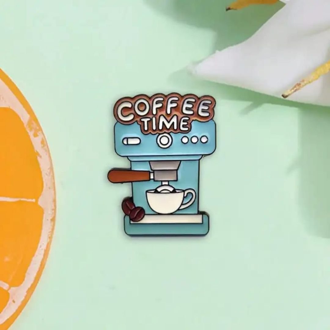 The pin is shaped as a retro-style espresso machine. The body is a warm teal blue — the kind of cheerful, cafe-counter colour that feels immediately familiar. A brown portafilter handle extends to the left. A white espresso cup sits positioned beneath the group head, ready for the pour. Two coffee beans rest at the bottom left, adding a grounded, realistic touch. Above the machine, COFFEE TIME is rendered in bold brown bubble lettering — rounded, warm, and completely unambiguous about priorities. As a result, the design communicates an entire personality in under 3 square centimetres.