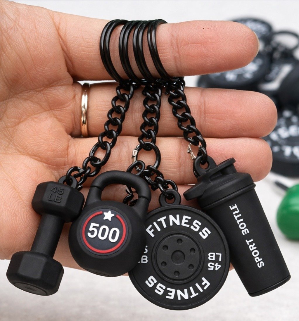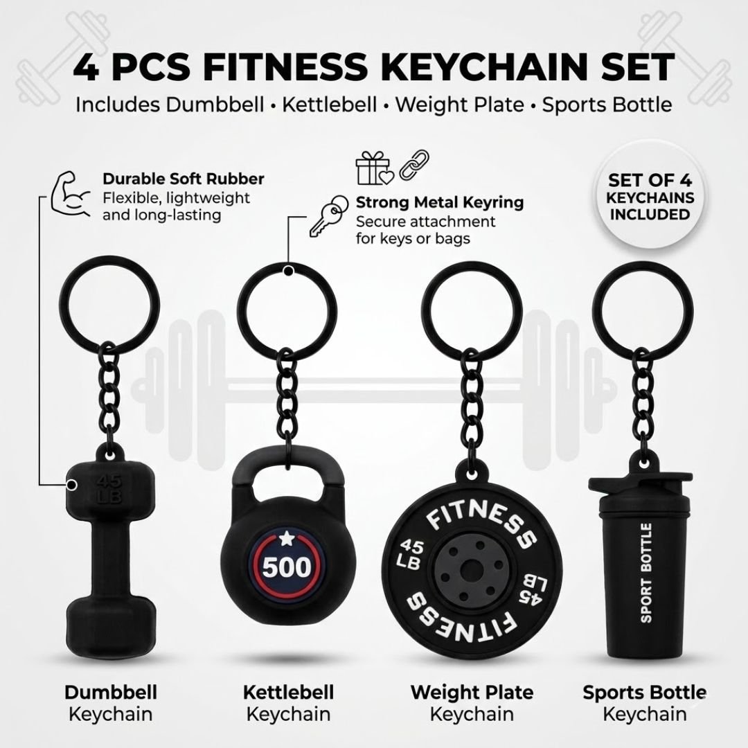 Add a sporty touch to your everyday accessories with this Fitness Keychain Set of 4. Designed for gym lovers and fitness enthusiasts, the set includes miniature dumbbell, kettlebell, weight plate and sports bottle designs.