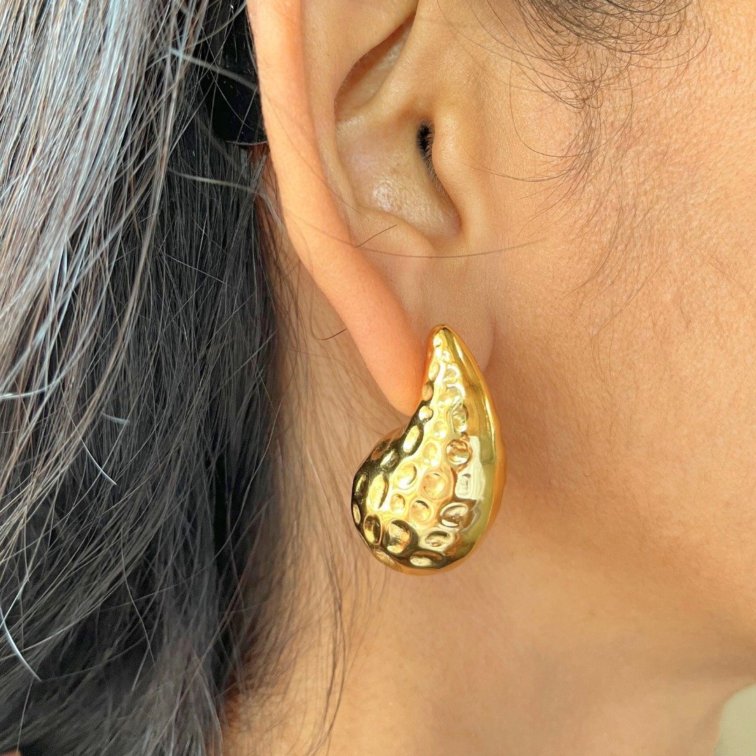 The Gilded Drop Earrings redefine elegance with their bold, sculptural form and fluid texture. Designed to resemble molten gold frozen in motion, these asymmetric teardrop-shaped earrings feature a hammered finish that enhances their dynamic appeal. The high-shine gold surface reflects light beautifully, making them a striking accessory for any occasion.