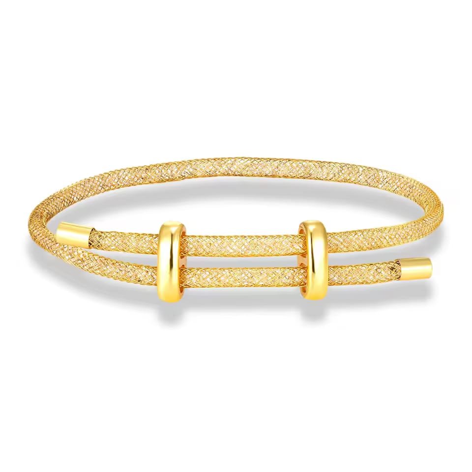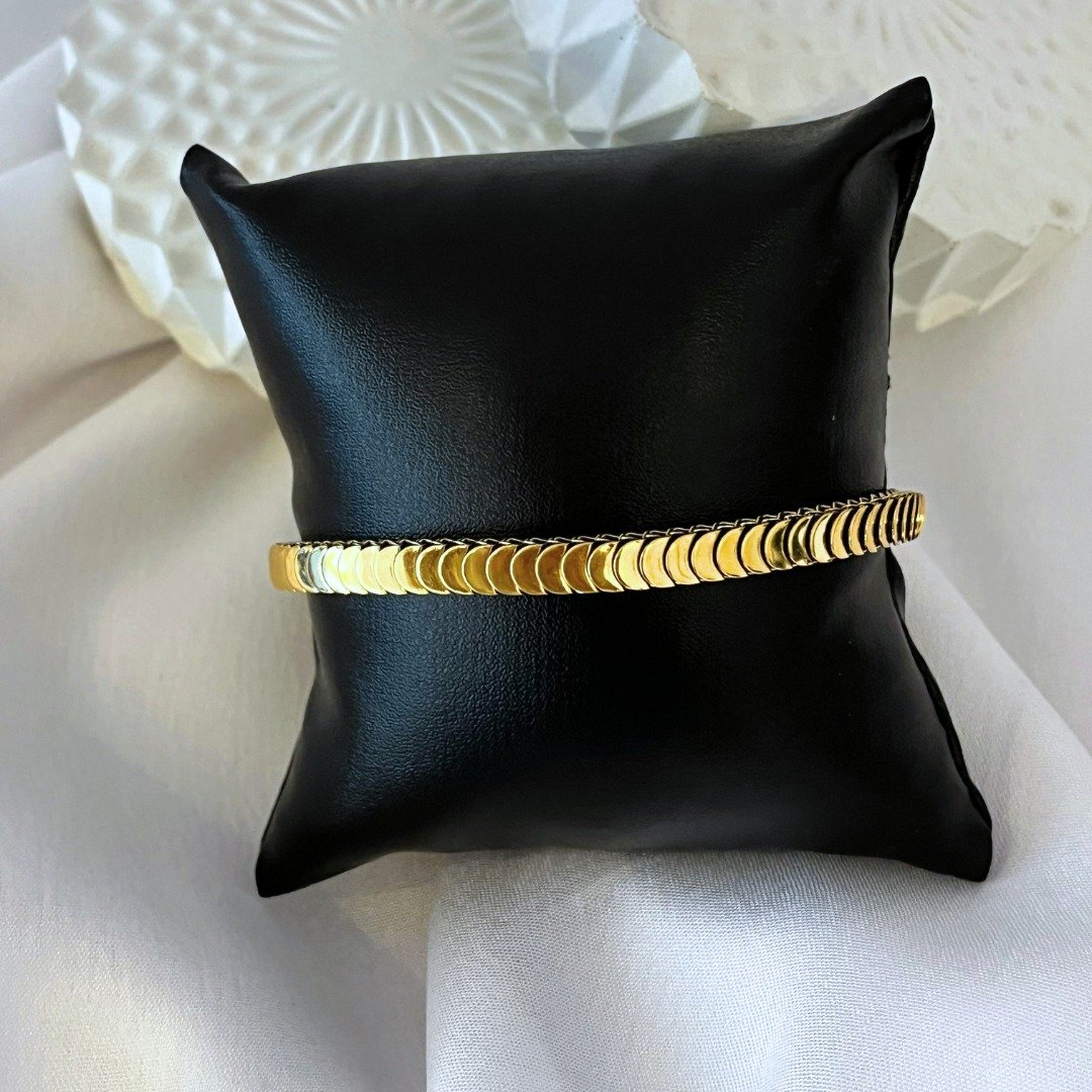 Crafted from high-quality stainless steel and finished in rich 18K gold tone, the bracelet features a smooth, flat herringbone structure made from tiny crescent-shaped links. Each link catches the light with a subtle shimmer, creating a liquid-gold effect that effortlessly complements both casual and formal outfits. The flexible design allows the bracelet to sit flush against the skin, offering supreme comfort and a refined silhouette.