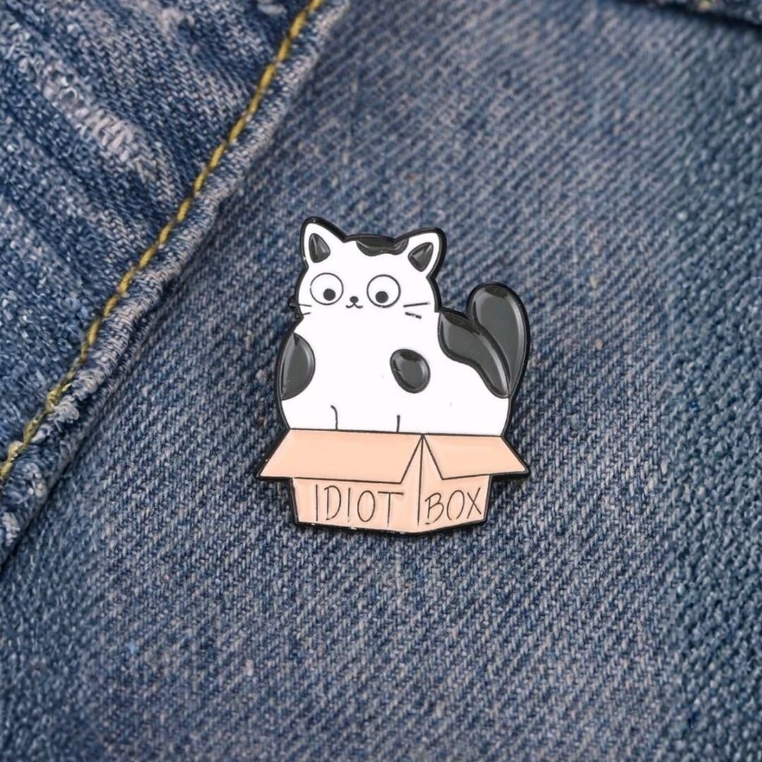For collectors, the Idiot Box Cat Pin works well as a display piece. It pairs naturally with other cat pins, humour pins, and pop culture designs. The illustrated style and warm tan-and-black-and-white palette is versatile within curated collections.