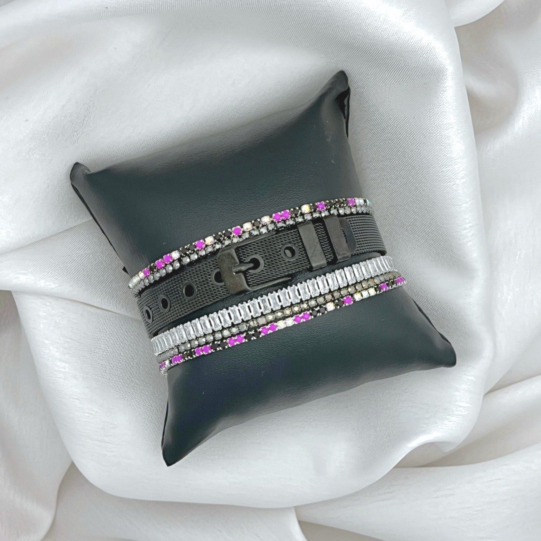 The stack includes two matching outer bracelets with purple and clear cubic zirconia stones against a black beaded base, framing the design with bold elegance. The second and fifth bracelets mirror each other, featuring a refined black-and-white pattern for a balanced touch. At the center, a matte black metal belt bracelet adds a modern twist, while the diamante band with rectangular stones enhances the overall luxurious feel.