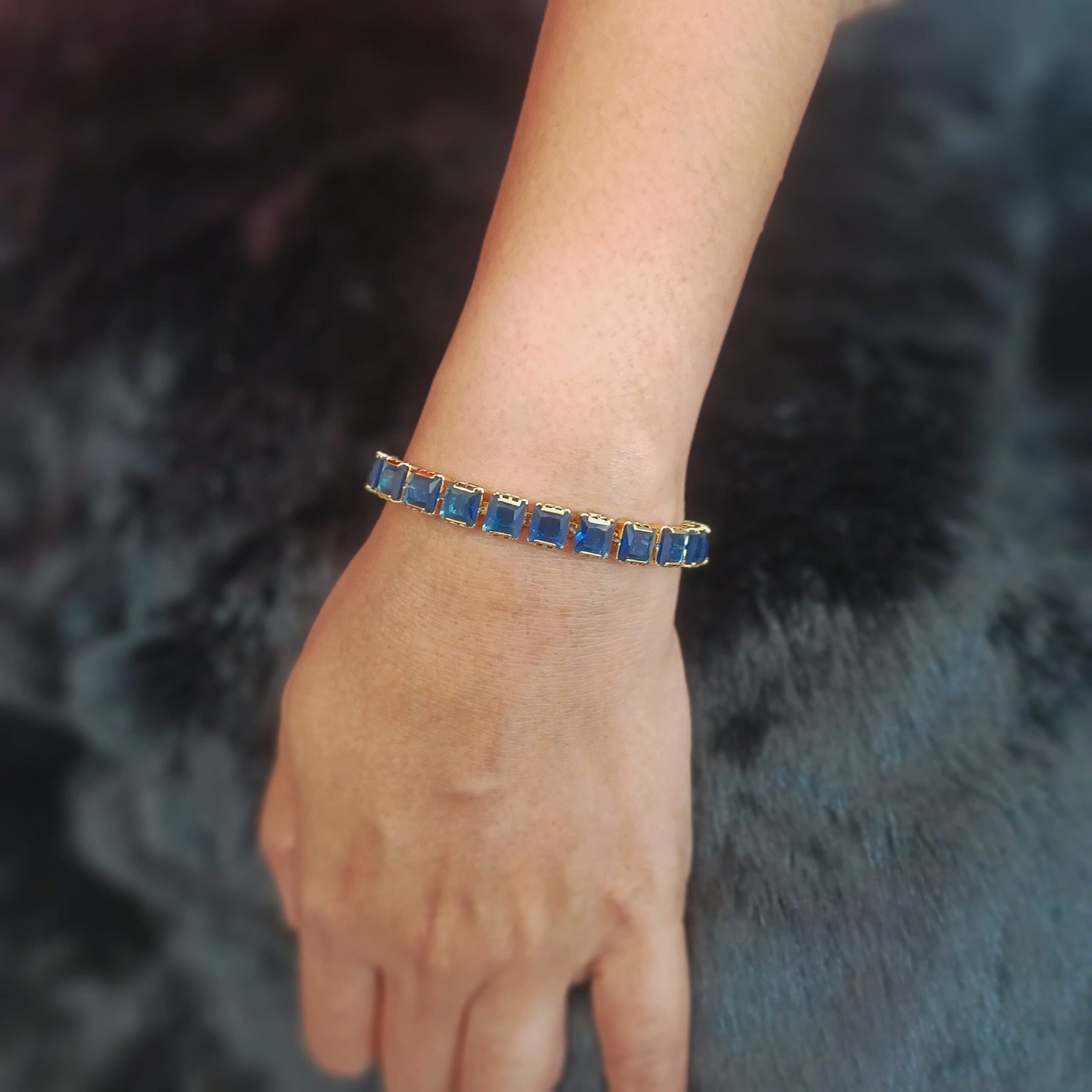 Step into elegance with the Midnight Muse Bracelet, where deep sapphire-blue crystals and rich golden settings create a timeless tribute to nightfall glamour. This exquisite piece is designed for those who appreciate bold beauty wrapped in subtle sophistication. Each square-cut navy crystal is delicately hand-set into a radiant gold-tone casing, forming a seamless band of luxurious depth and brilliance.