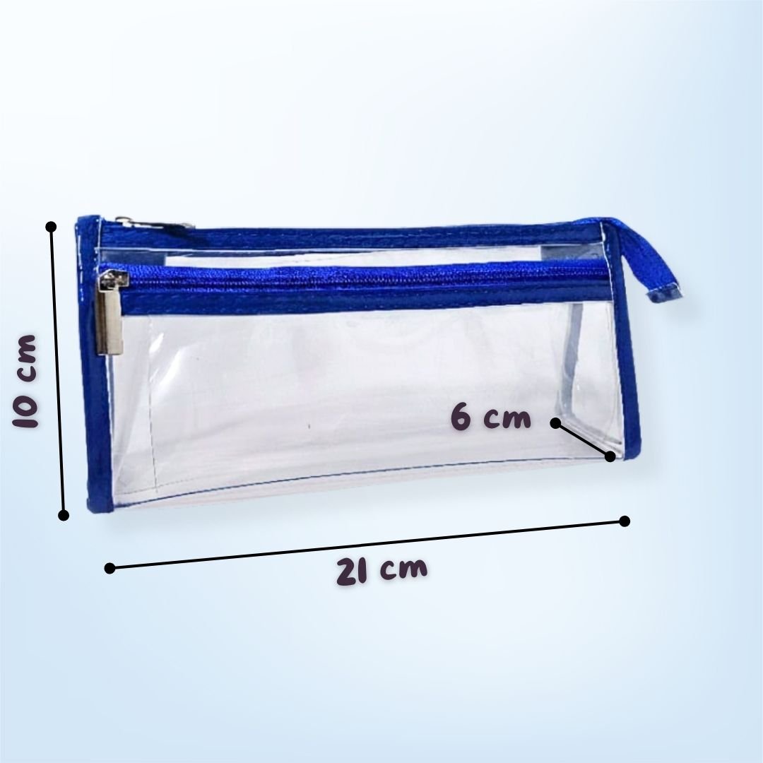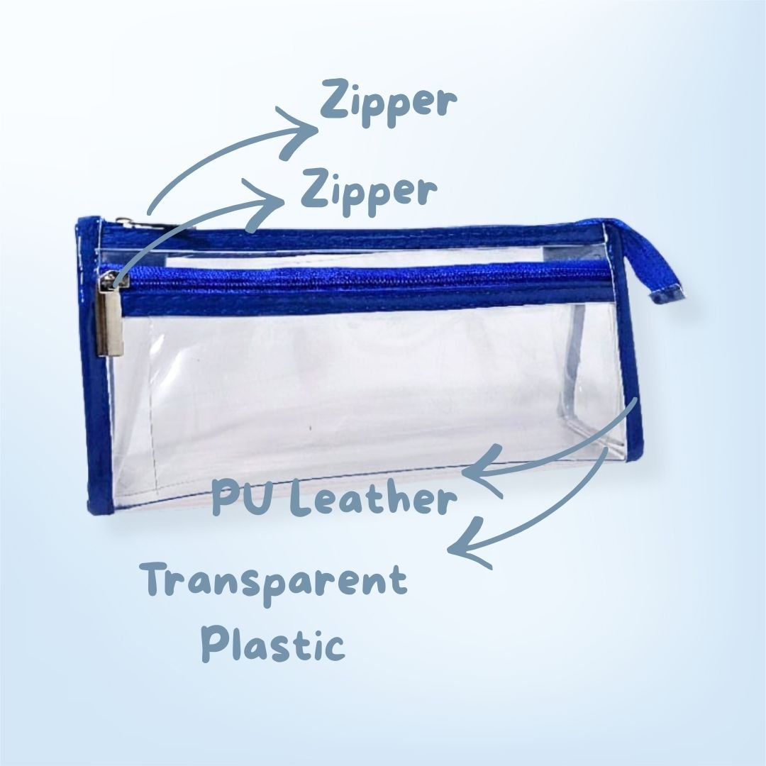 Keep your stationery neat and visible with this transparent pencil pouch featuring a sturdy zipper and navy blue PU leather trim. Ideal for school, office, and everyday use.